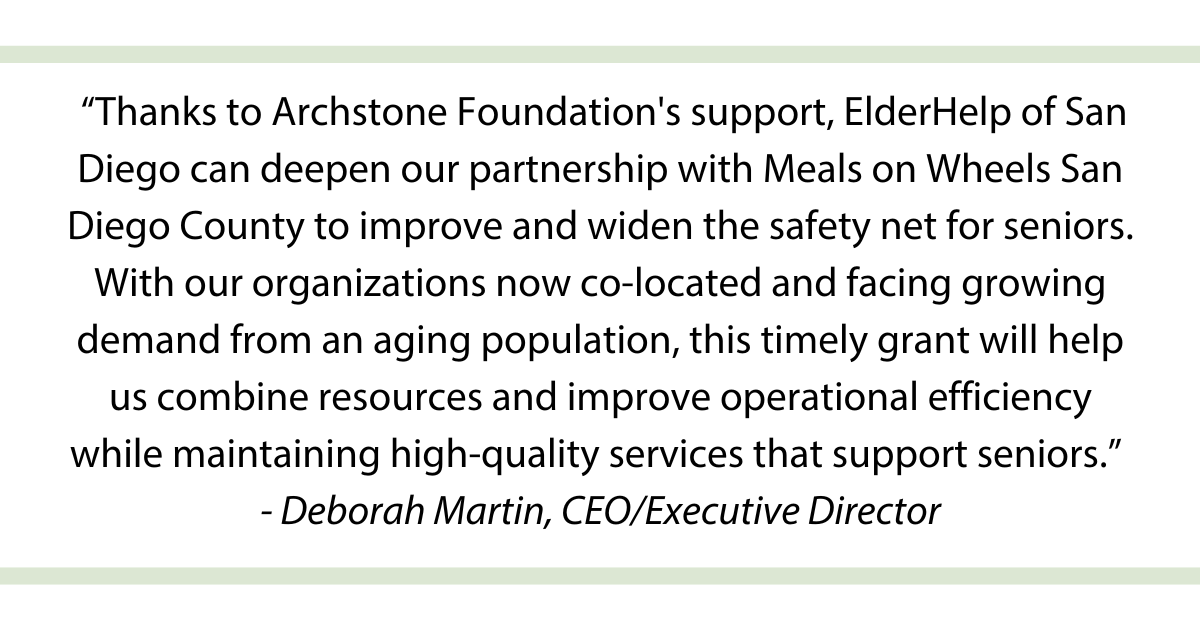 ElderHelp of San Diego recently moved its offices and pantry into the facilities of Meals on Wheels San Diego County, allowing both organizations to more effectively and efficiently support the health and wellness of older adults by reducing duplication of services and improving care coordination and referrals. ElderHelp will use its grant to engage a program and service integration specialist to implement synergies between the two organizations. By integrating whenever practical but also embracing unique programs, each organization can strengthen its range of services, develop workflows to coordinate care, and improve access to care.