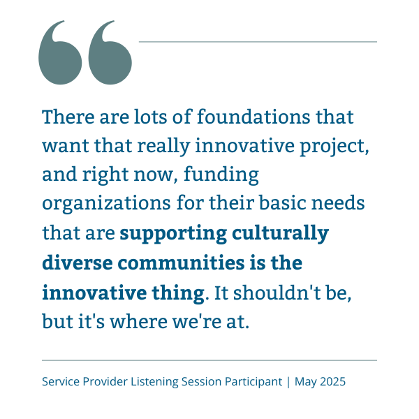 - These organizations recognize that it is a struggle to respond to policy changes, engage in advocacy efforts, and educate their communities on top of the direct service work for which they are already responsible.